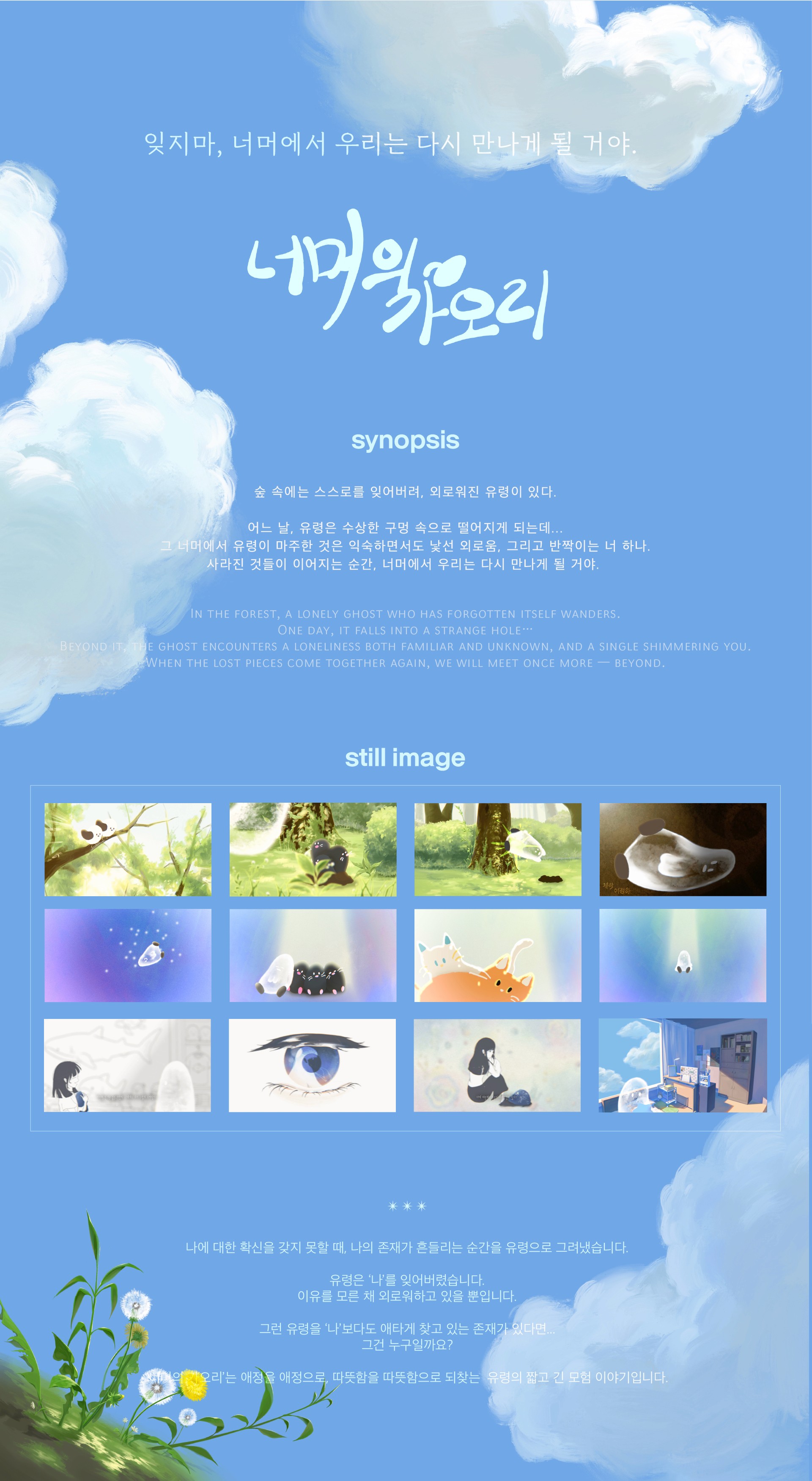 그 너머에서 유령이 마주한 것은 익숙하면서도 낯선 외로움, 그리고 반짝이는 너 하나. 사라진 것들이 이어지는 순간, 너머에서 우리는 다시 만나게 될 거야.